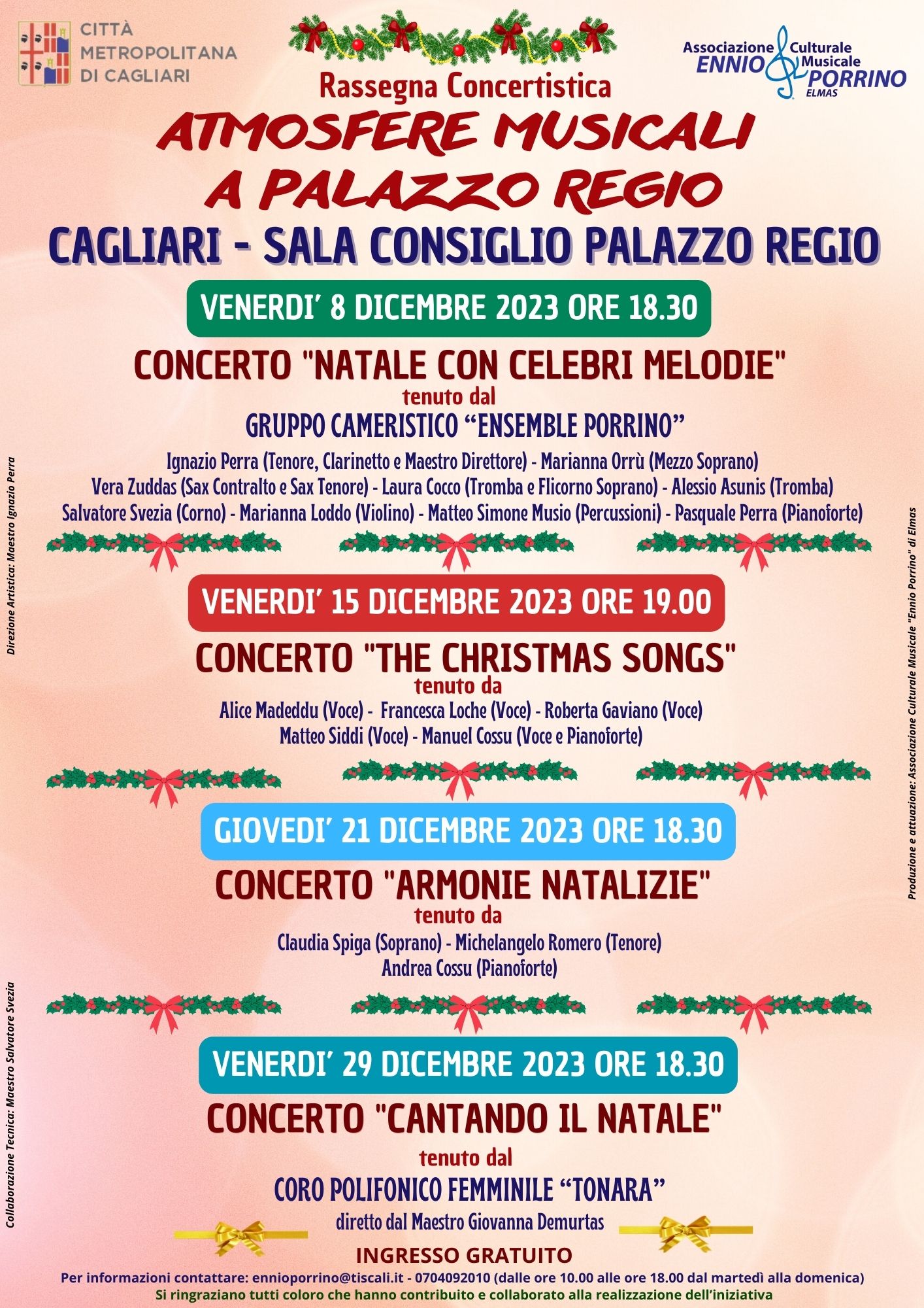 Il prestigioso Palazzo Regio di Cagliari si prepara ad accogliere un’esclusiva serie di concerti natalizi a ingresso gratuito nel mese di dicembre. Questo evento culturale è una collaborazione tra la Città Metropolitana di Cagliari e l’Associazione Musicale Ennio Porrino. La rassegna, intitolata “Atmosfere musicali a Palazzo Regio“, vede la Direzione Artistica del Maestro Ignazio Perra e promette di incantare il pubblico con la sua varietà e qualità.