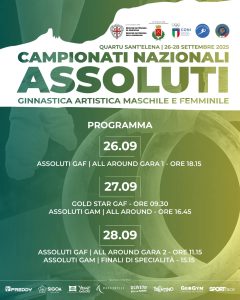 - Sabato 27 settembre – Ore 9:30: Gold Star GAF femminile; ore 16:45: Assoluti GAM (maschile) all Around, valido per il titolo e qualificazioni alle finali