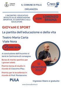 Promosso dall’Amministrazione Comunale, Pula ospiterà domani, 12 dicembre 2025, un evento educativo di grande rilevanza presso il Teatro Maria Carta. A partire dalle 16:30, il Dottor Lorenzo Braina terrà l’incontro dal titolo “Giovani e sport. La partita dell’educazione della vita”, rivolto a associazioni sportive, genitori ed educatori. L’incontro si concentrerà sul ruolo fondamentale che lo sport riveste nella crescita e nell’educazione dei giovani, offrendo spunti di riflessione e formazione per tutti coloro che sono coinvolti nell’accompagnamento dei ragazzi attraverso il mondo sportivo.